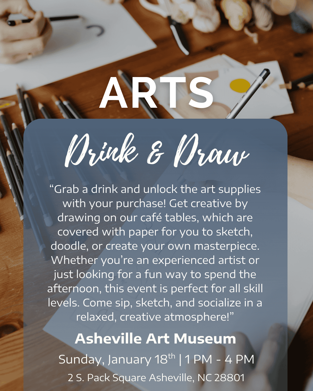 “Grab a drink and unlock the art supplies with your purchase! Get creative by drawing on our café tables, which are covered with paper for you to sketch, doodle, or create your own masterpiece. Whether you’re an experienced artist or just looking for a fun way to spend the afternoon, this event is perfect for all skill levels. Come sip, sketch, and socialize in a relaxed, creative atmosphere!”