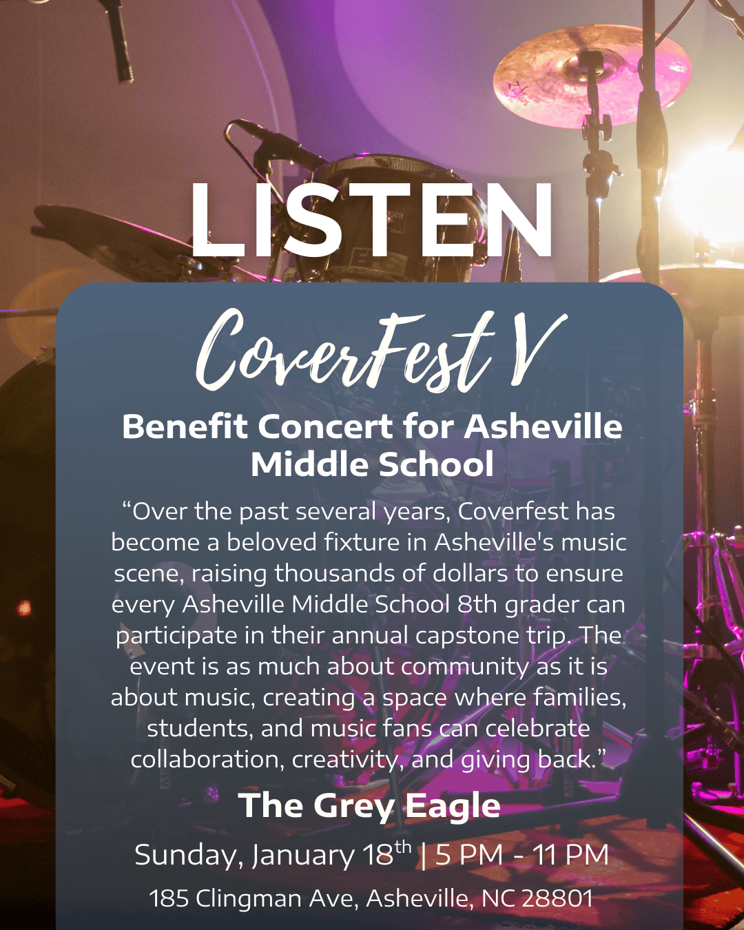 “Over the past several years, Coverfest has become a beloved fixture in Asheville's music scene, raising thousands of dollars to ensure every Asheville Middle School 8th grader can participate in their annual capstone trip. The event is as much about community as it is about music, creating a space where families, students, and music fans can celebrate collaboration, creativity, and giving back.”