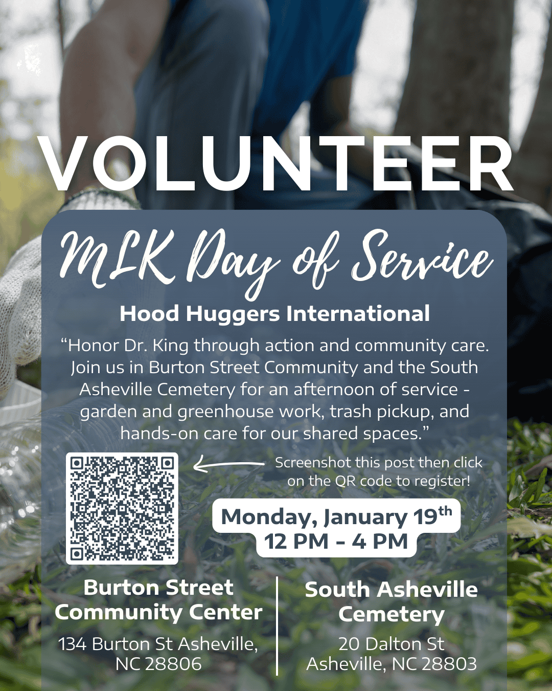 “Honor Dr. King through action and community care. Join us in Burton Street Community and the South Asheville Cemetery for an afternoon of service - garden and greenhouse work, trash pickup, and hands-on care for our shared spaces.”