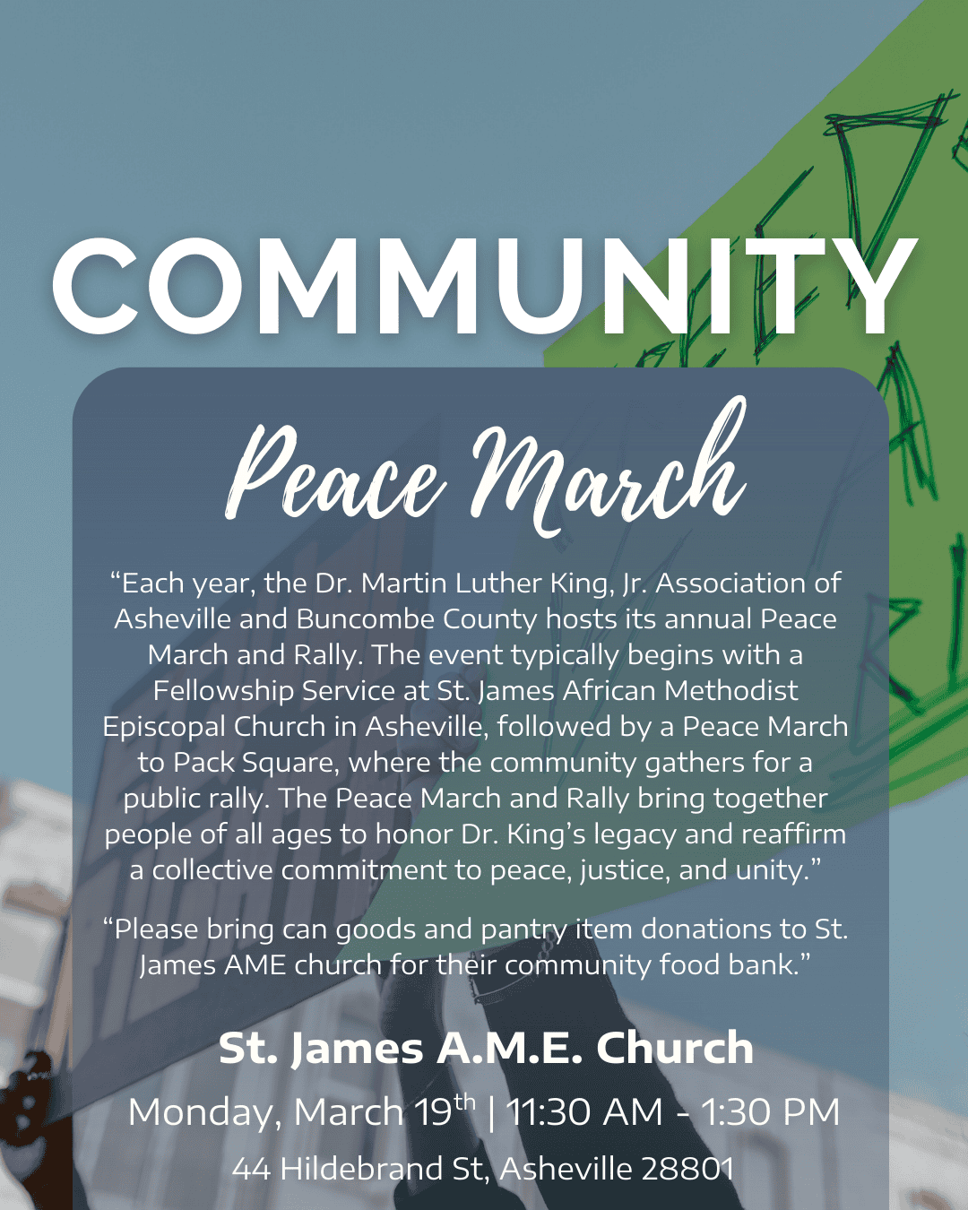 “Each year, the Dr. Martin Luther King, Jr. Association of Asheville and Buncombe County hosts its annual Peace March and Rally. The event typically begins with a Fellowship Service at St. James African Methodist Episcopal Church in Asheville, followed by a Peace March to Pack Square, where the community gathers for a public rally. The Peace March and Rally bring together people of all ages to honor Dr. King’s legacy and reaffirm a collective commitment to peace, justice, and unity.”