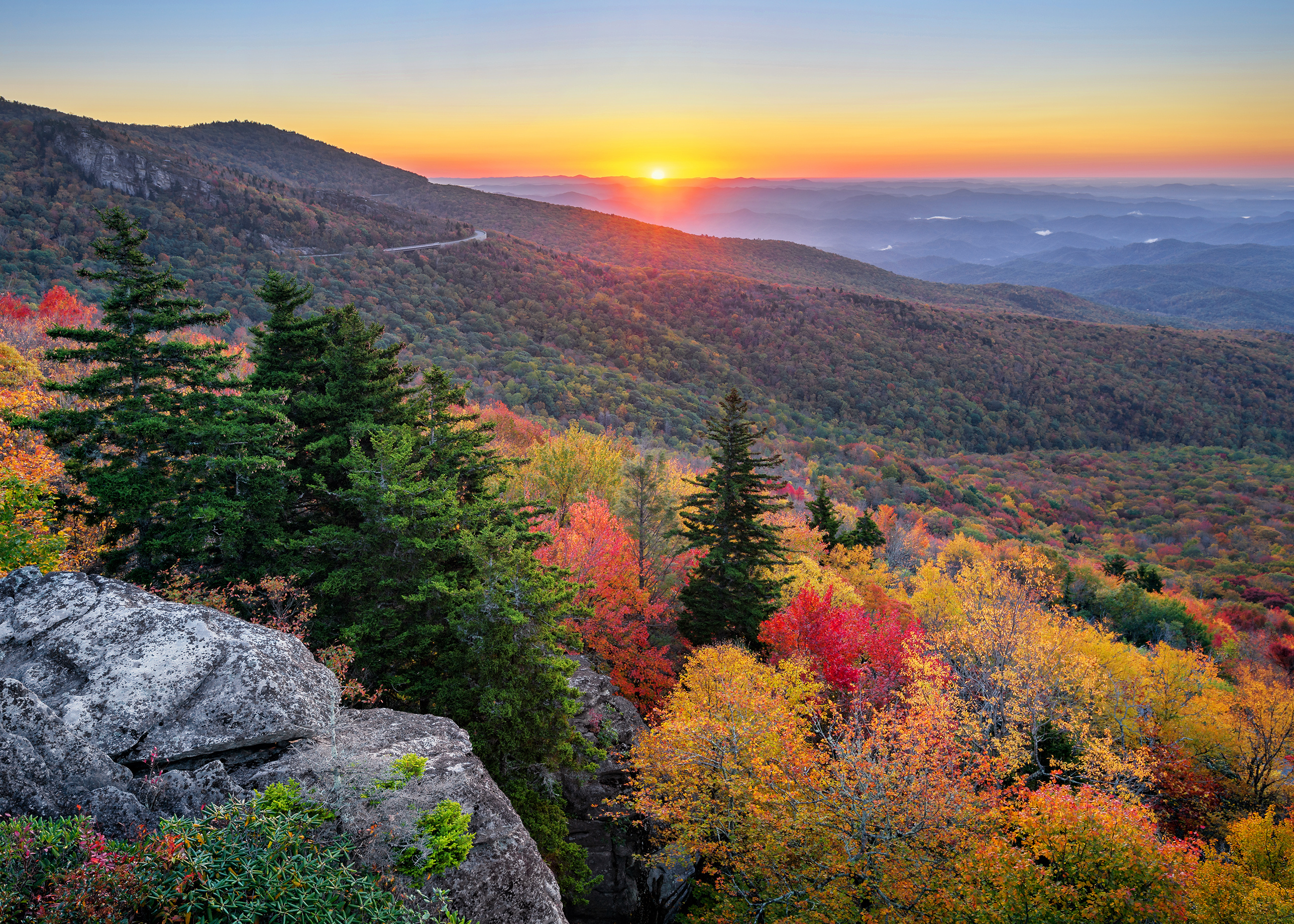 Take a leisurely drive along the famed Blue Ridge Parkway, which is magical in any season. The 469-mile scenic road offers stunning vistas and mountain meadows, and is also home to numerous campgrounds, picnic areas, and trails.