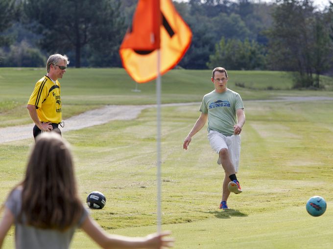 Combining elements of soccer and golf, FootGolf is played on a golf course, with 21-inch holes large enough to accommodate a soccer ball cut near putting greens.
