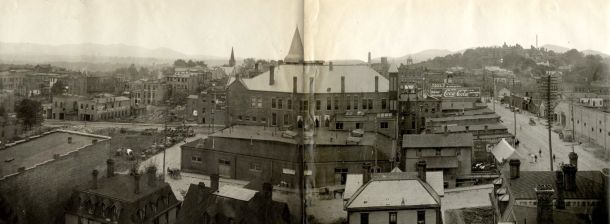 A rare downtown panorama shot from 1904, looking west from the Buncombe County Courthouse. Asheville City Hall dominates the center of the photo, with the first Battery Park Hotel seen on the ridge on the right. Courtesy North Carolina Collection, Pack Memorial Library
