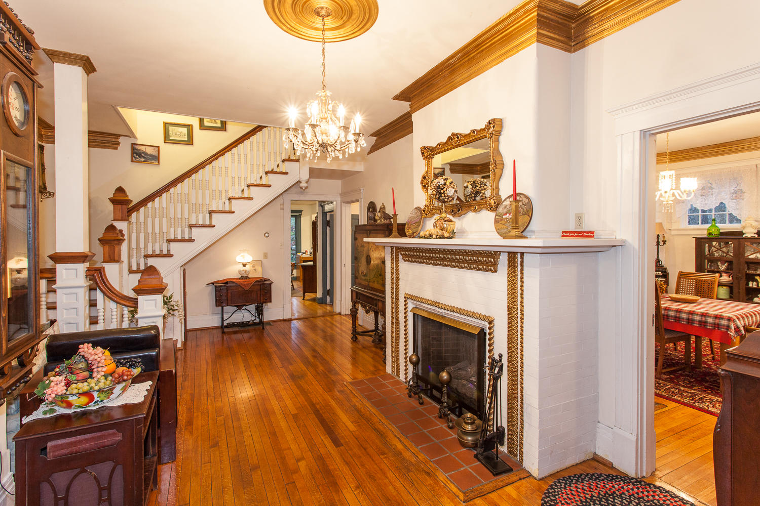 Just beyond the front door, next to the high-ceilinged foyer, is a light-filled dining room featuring a crystal chandelier and a fireplace with a hand-carved brick mantle, along with a brass weather vane in one corner. In the kitchen, next to a tiny butler's pantry with a pass-through serving window, metal bars partially cover the windows, a vestige of the turn of the last century, when they were needed to guard against looting.