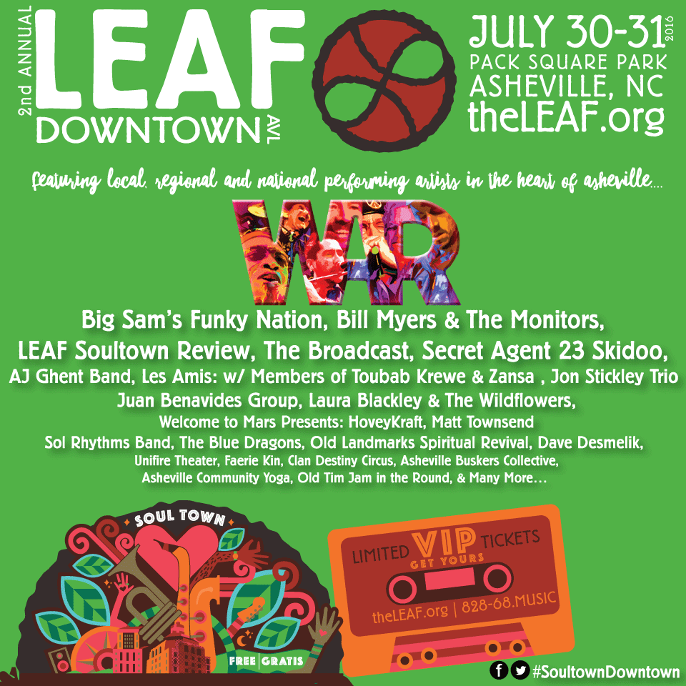 “Join us at LEAF Downtown AVL 2016 to celebrate music, art and culture from July 30 & 31, presenting a powerful “Soultown” theme bringing the very best soul, funk, R&B and world music talent to one and ALL – for FREE! Get ready for a fully immersive experience, welcoming families and all walks of life to gather as one community in our beautiful mountain city. LEAF Downtown AVL will feature a wealth of community partner programming including the return of our Voices of Asheville tent, dozens of family adventures activities, three stages featuring local, regional & national talent, 80+ local culinary and craft arts vendors curated in part by Asheville Grown, roaming performers galore, a one-of-a-kind VIP experience and our second annual LEAF Art Dash 5K. LEAF Downtown AVL first emerged onto the Asheville scene August 2015 as an expansion of the LEAF Community Arts’ mission to connect cultures and create community through music and arts. Last year, LEAF welcomed over 15,000 attendees in what we consider to be a turning point in the evolution of our organization and a powerful bridge of inclusion for our community. This summer LEAF Downtown AVL furthers its vision to celebrate creativity, diversity and families in the heart of Downtown Asheville with a Soultown experience unlike any other!” – Ehren Cruz, Performing Arts Director