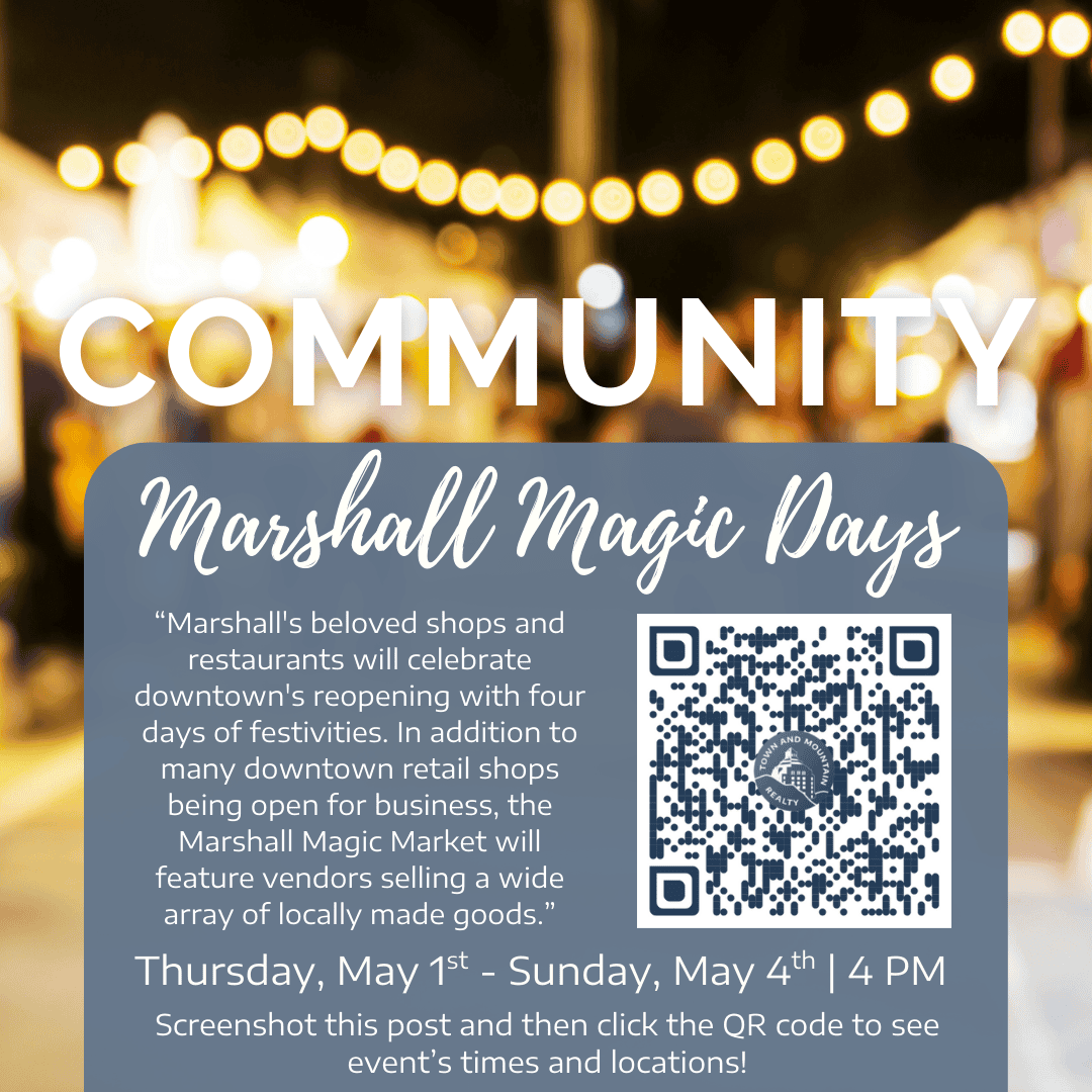 “Marshall's beloved shops and restaurants will celebrate downtown's reopening with four days of festivities. In addition to many downtown retail shops being open for business, the Marshall Magic Market will feature vendors selling a wide array of locally made goods.”