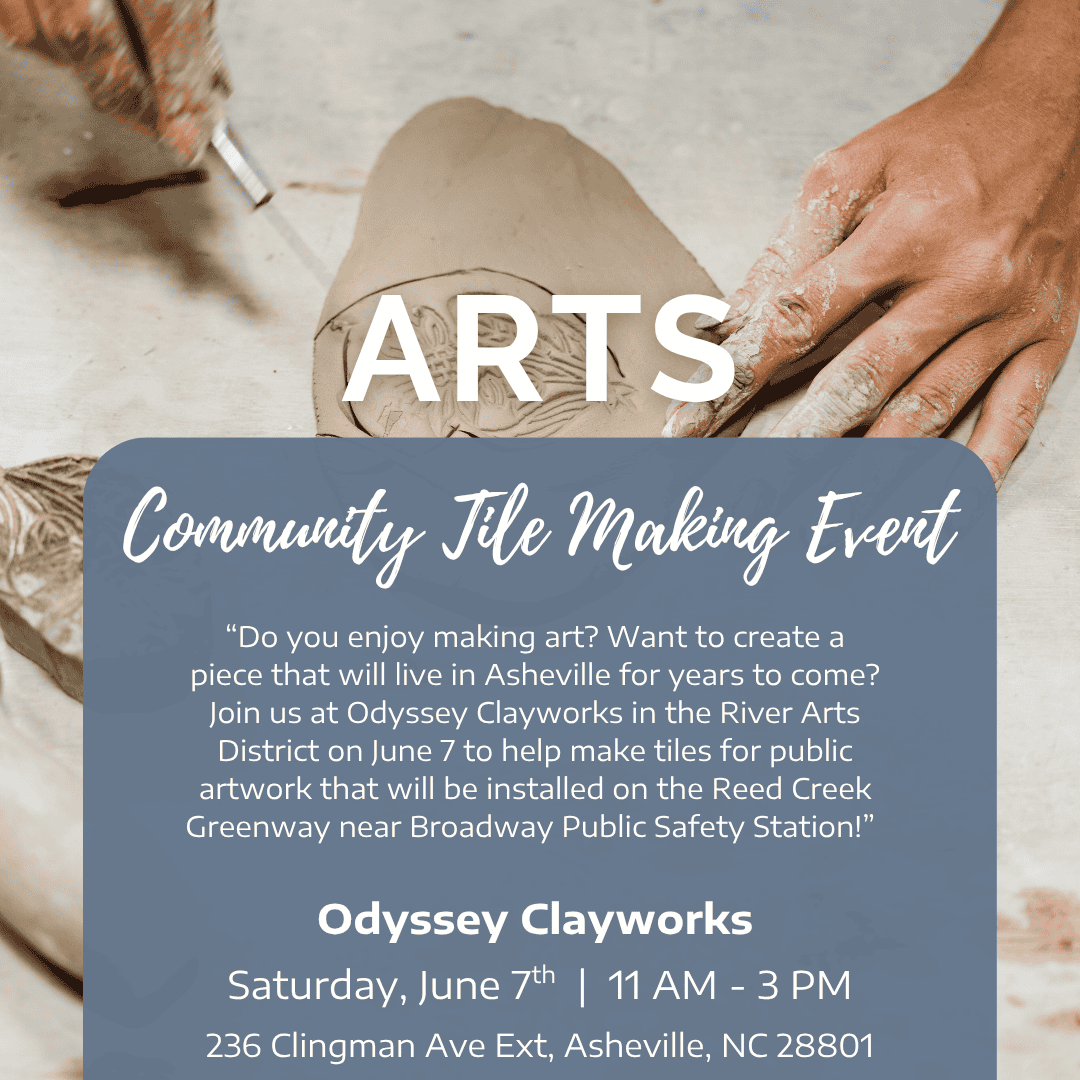 “Do you enjoy making art? Want to create a piece that will live in Asheville for years to come? Join us at Odyssey Clayworks in the River Arts District on June 7 to help make tiles for public artwork that will be installed on the Reed Creek Greenway near Broadway Public Safety Station!”