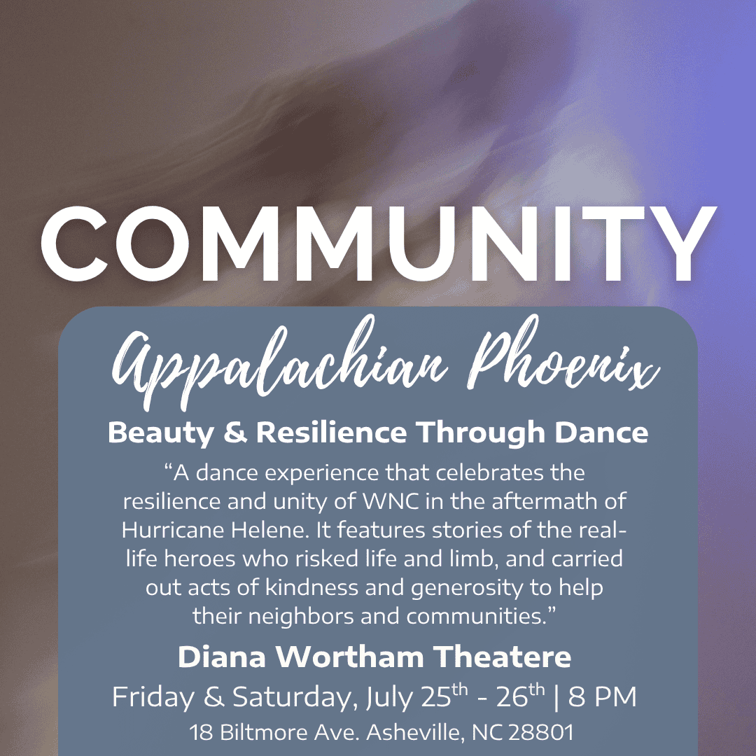 “A dance experience that celebrates the resilience and unity of WNC in the aftermath of Hurricane Helene. It features stories of the real-life heroes who risked life and limb, and carried out acts of kindness and generosity to help their neighbors and communities.”