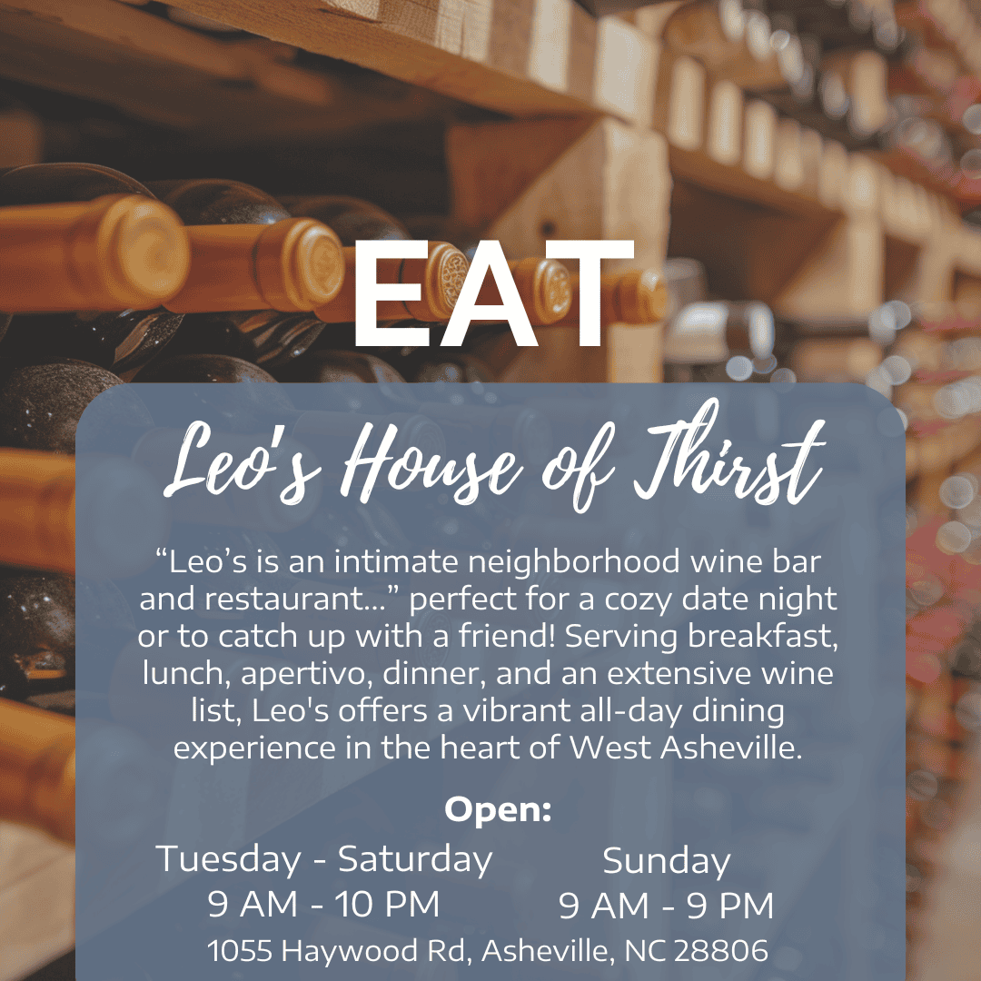 “Leo’s is an intimate neighborhood wine bar and restaurant...” perfect for a cozy date night or to catch up with a friend! Serving breakfast, lunch, apertivo, dinner and an extensive wine list, Leo's offers a vibrant all-day dining experience in the heart of West Asheville.
