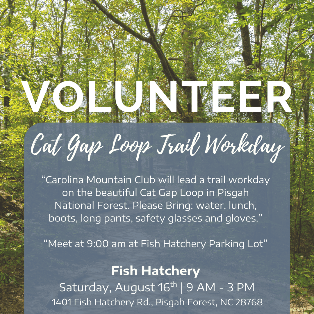 “Carolina Mountain Club will lead a trail workday on the beautiful Cat Gap Loop in Pisgah National Forest. Please Bring: water, lunch, boots, long pants, safety glasses and gloves.”