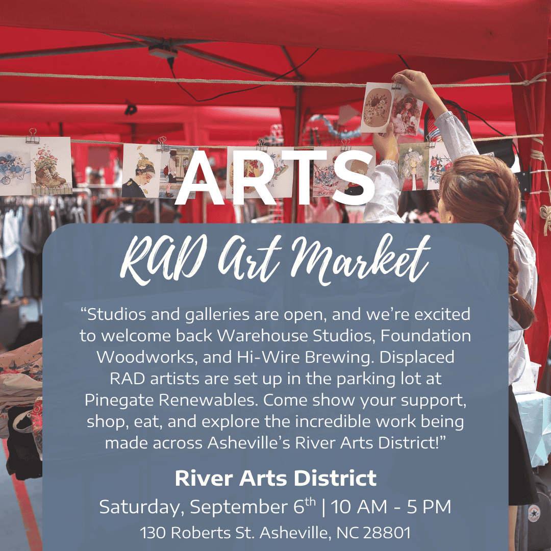 “Studios and galleries are open, and we’re excited to welcome back Warehouse Studios, Foundation Woodworks, and Hi-Wire Brewing. Displaced RAD artists are set up in the parking lot at Pinegate Renewables. Come show your support, shop, eat, and explore the incredible work being made across Asheville’s River Arts District!”