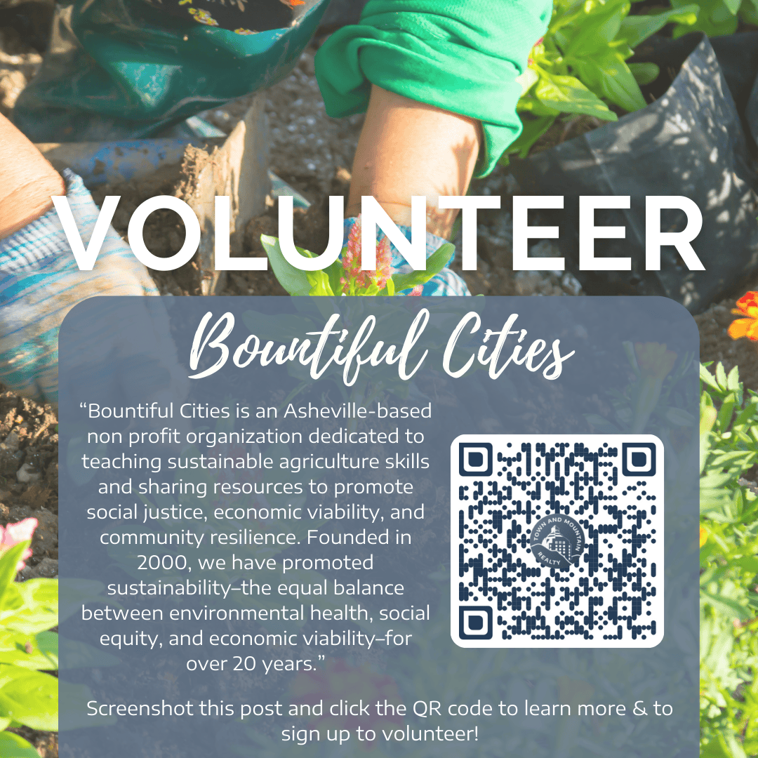 “Bountiful Cities is an Asheville-based non profit organization dedicated to teaching sustainable agriculture skills and sharing resources to promote social justice, economic viability, and community resilience. Founded in 2000, we have promoted sustainability–the equal balance between environmental health, social equity, and economic viability–for over 20 years.”