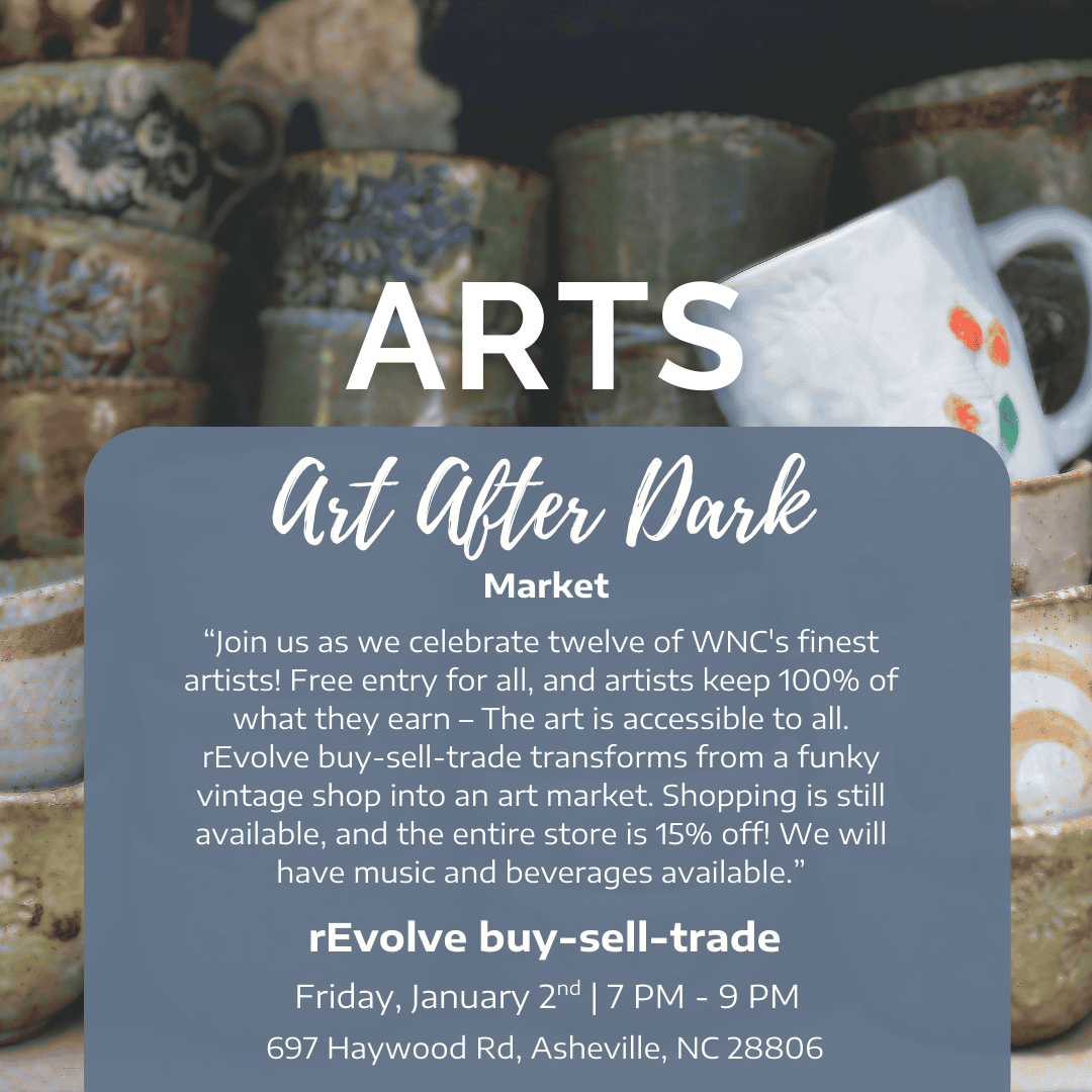 “Join us as we celebrate twelve of WNC's finest artists! Free entry for all, and artists keep 100% of what they earn – The art is accessible to all. rEvolve buy-sell-trade transforms from a funky vintage shop into an art market. Shopping is still available, and the entire store is 15% off! We will have music and beverages available.”