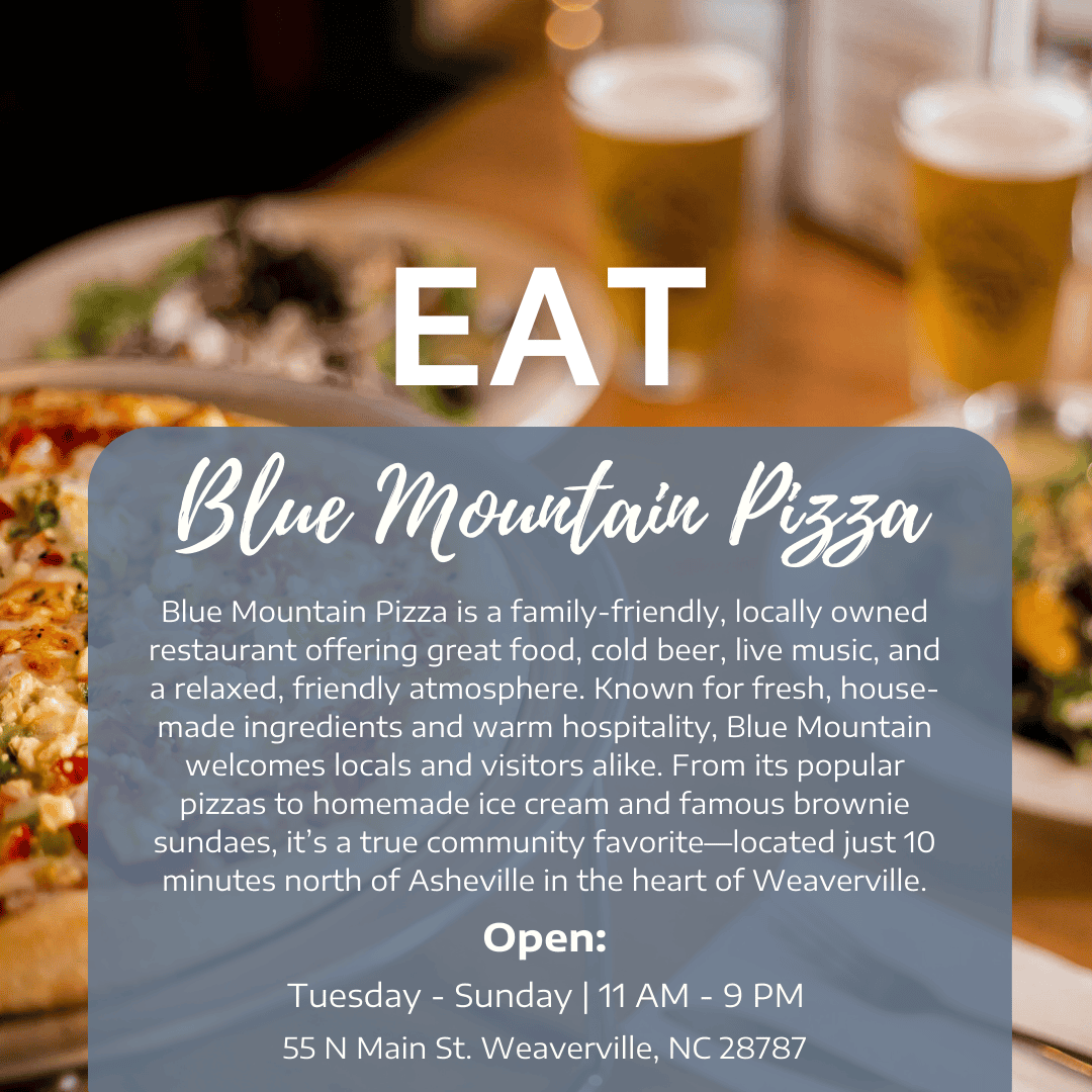 Blue Mountain Pizza is a family-friendly, locally owned restaurant offering great food, cold beer, live music, and a relaxed, friendly atmosphere. Known for fresh, house-made ingredients and warm hospitality, Blue Mountain welcomes locals and visitors alike. From its popular pizzas to homemade ice cream and famous brownie sundaes, it’s a true community favorite—located just 10 minutes north of Asheville in the heart of Weaverville.