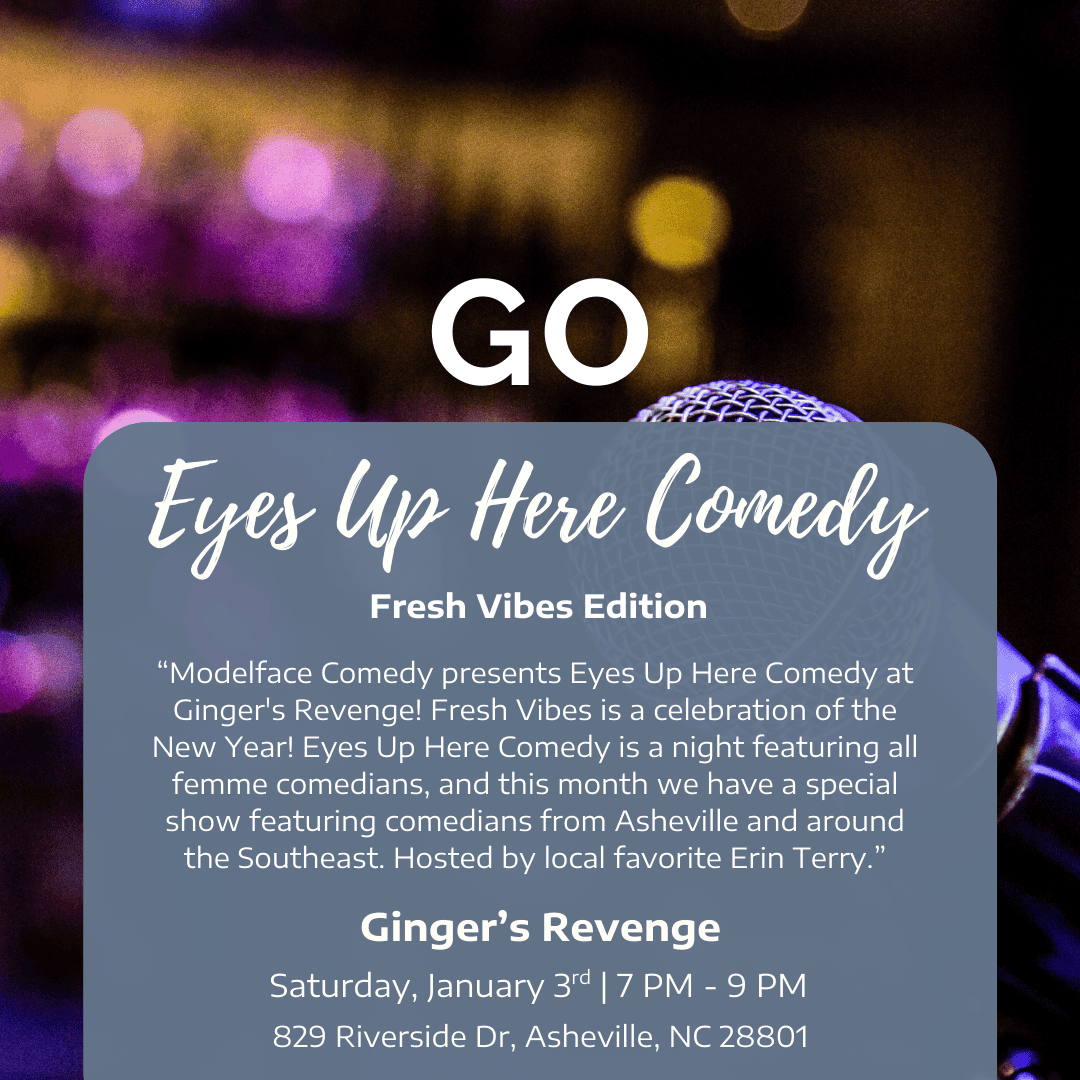 “Modelface Comedy presents Eyes Up Here Comedy at Ginger's Revenge! Fresh Vibes is a celebration of the New Year! Eyes Up Here Comedy is a night featuring all femme comedians, and this month we have a special show featuring comedians from Asheville and around the Southeast. Hosted by local favorite Erin Terry.”
