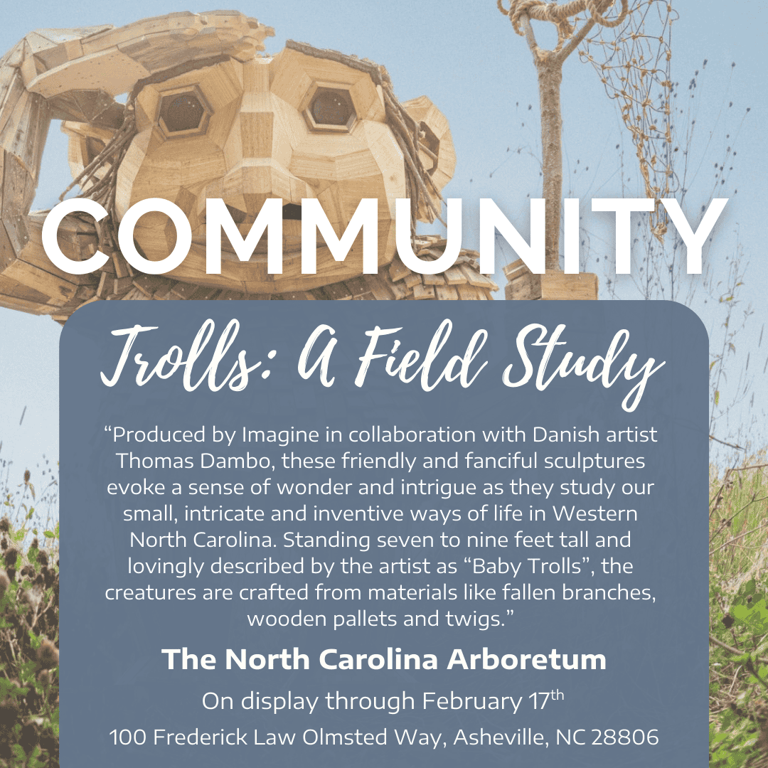 “Produced by Imagine in collaboration with Danish artist Thomas Dambo, these friendly and fanciful sculptures evoke a sense of wonder and intrigue as they study our small, intricate and inventive ways of life in Western North Carolina. Standing seven to nine feet tall and lovingly described by the artist as “Baby Trolls”, the creatures are crafted from materials like fallen branches, wooden pallets and twigs.”