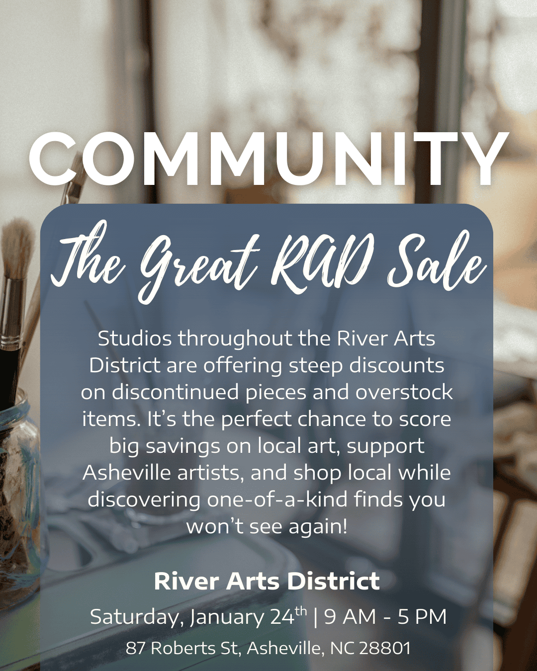 Studios throughout the River Arts District are offering steep discounts on discontinued pieces and overstock items. It’s the perfect chance to score big savings on local art, support Asheville artists, and shop local while discovering one-of-a-kind finds you won’t see again!