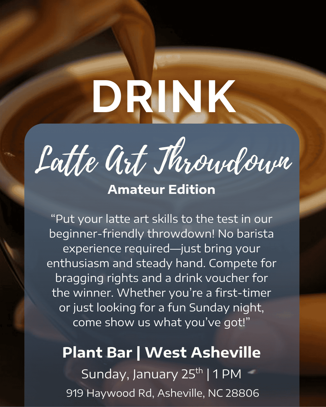 “Put your latte art skills to the test in our beginner-friendly throwdown! No barista experience required—just bring your enthusiasm and steady hand. Compete for bragging rights and a drink voucher for the winner. Whether you’re a first-timer or just looking for a fun Sunday night, come show us what you’ve got!”