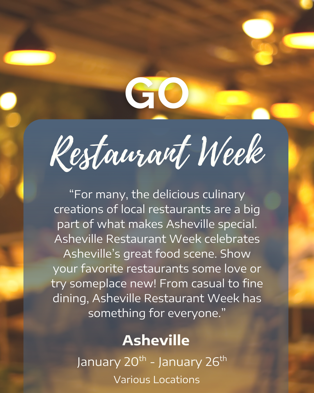 “For many, the delicious culinary creations of local restaurants are a big part of what makes Asheville special. Asheville Restaurant Week celebrates Asheville’s great food scene. Show your favorite restaurants some love or try someplace new! From casual to fine dining, Asheville Restaurant Week has something for everyone.”