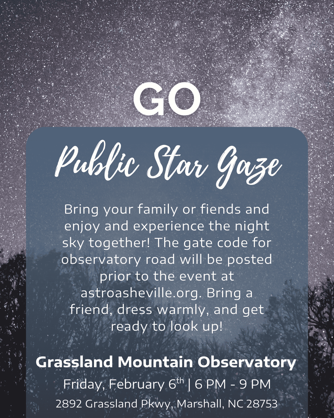 Bring your family or fiends and enjoy and experience the night sky together! The gate code for observatory road will be posted prior to the event at astroasheville.org. Bring a friend, dress warmly, and get ready to look up!