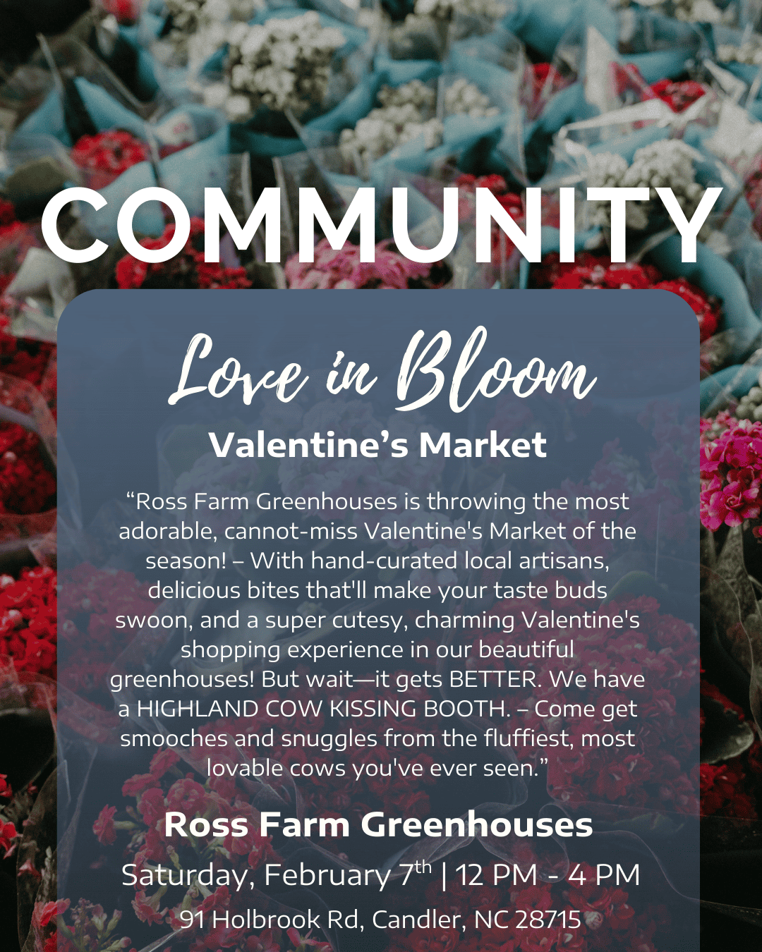 “Ross Farm Greenhouses is throwing the most adorable, cannot-miss Valentine's Market of the season! – With hand-curated local artisans, delicious bites that'll make your taste buds swoon, and a super cutesy, charming Valentine's shopping experience in our beautiful greenhouses! But wait—it gets BETTER. We have a HIGHLAND COW KISSING BOOTH. – Come get smooches and snuggles from the fluffiest, most lovable cows you've ever seen.”