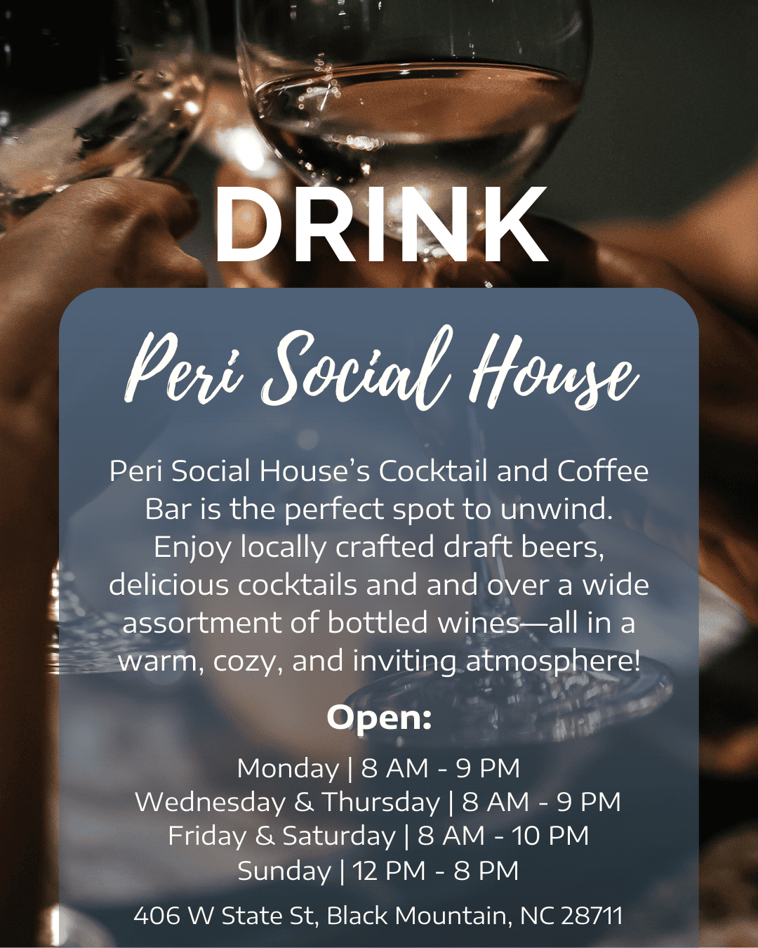 Peri Social House’s Cocktail and Coffee Bar is the perfect spot to unwind. Enjoy locally crafted draft beers, delicious cocktails and and over a wide assortment of bottled wines—all in a warm, cozy, and inviting atmosphere!
