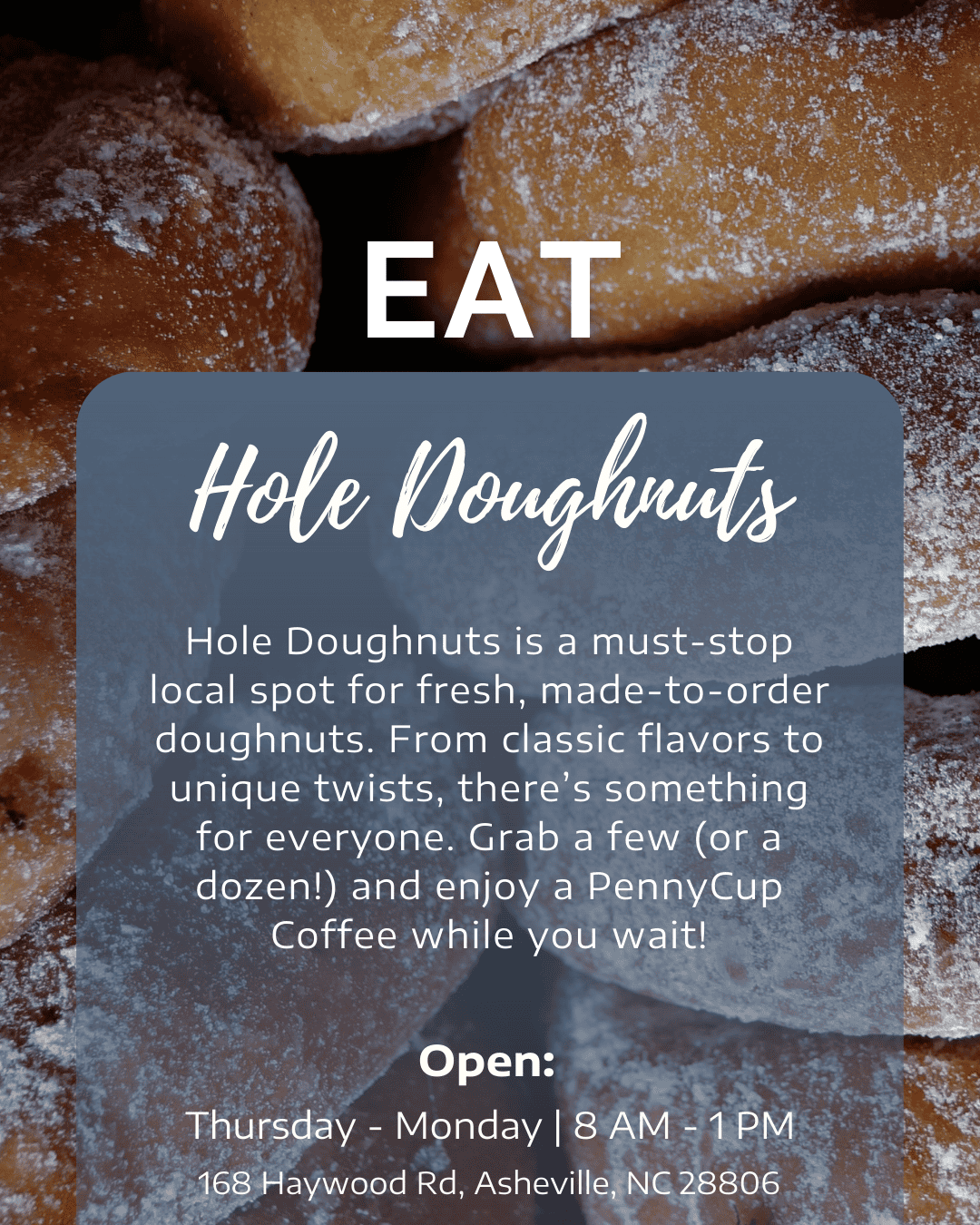 Hole Doughnuts is a must-stop local spot for fresh, made-to-order doughnuts. From classic flavors to unique twists, there’s something for everyone. Grab a few (or a dozen!) and enjoy a PennyCup Coffee while you wait!